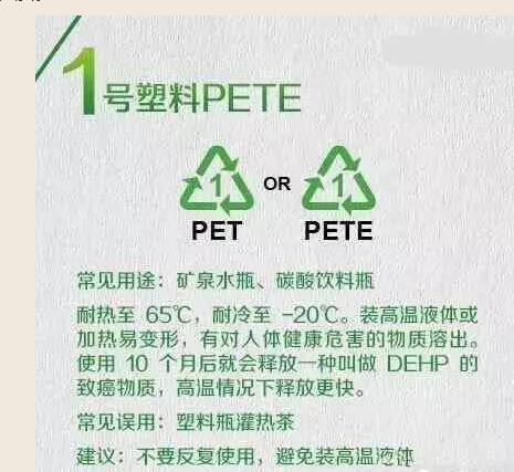常見(jiàn)礦泉水瓶、碳酸飲料瓶等 。耐熱至70℃易變形, 有對(duì)人體有害的物質(zhì)融出。1號(hào)塑料品用了10個(gè)月后,可能釋放出致癌物DEHP。不能放在汽車內(nèi)曬太陽(yáng);不要裝酒、油等物質(zhì)。